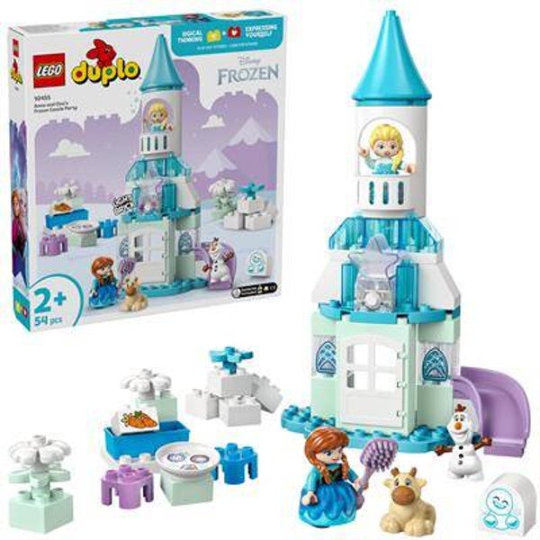 Laat peuters opgaan in een wereld vol creatief speelplezier met het bouwbare LEGO DUPLO Disney Anna en Elsa's Frozen kasteelfeest (10455) speelgoed. De set bevat de LEGO DUPLO Disney personages Elsa, Anna, Marshmallow de Snowgie, baby Sven en Olaf, waarmee peuters allerlei mogelijkheden hebben om te doen alsof ze in het kasteel wonen en voor baby Sven zorgen. Deze speelset met een bouwbaar kasteel zit boordevol leermomenten en helpt peuters hun fijne motoriek te ontwikkelen. Het bouwbare fantasiespeelgoed bevat accessoires om fantasierijk, verzorgend spel van peuters samen met hun ouders te stimuleren. Dit educatieve bouwspeelgoed voor peuters heeft veel details om de zintuigen te prikkelen. Elsa en Anna dragen stoffen rokken, er is een scharnierende deur die kleine vingertjes kunnen openen om de binnenkant van het Frozen kasteel te bekijken en de set bevat een meerkleurige verlichtingssteen die het noorderlicht voorstelt. Bevat 54 onderdelen. Geschikt vanaf 2 jaar.