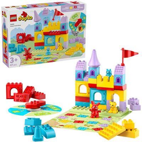 Geniet van urenlang plezier voor het hele gezin met het 2-in-1 bordspel LEGO DUPLO Hopsy's kasteelspel (10450). Peuters gaan op een leerzaam LEGO DUPLO avontuur en oefenen met tellen en kleuren terwijl ze een van de 2 leuke spellen spelen. Eerst leren peuters tellen en kleuren herkennen om een creatief kasteel te bouwen. Elke speler kiest een dier en draait aan de pijl om te zien hoeveel stappen ze mogen zetten op het bord. Vervolgens voegen ze een steen toe aan hun model in de kleur waarop ze zijn geland. Het spel eindigt als alle personages bij het kasteel zijn. In de tweede variant moeten peuters kleuren sorteren om te zien wie de hoogste toren kan bouwen. De spelers draaien aan de pijl om te zien welke kleur steen ze aan hun model kunnen toevoegen. Dit educatieve speelgoed zit boordevol leerzame momenten zoals op je beurt wachten, fantasierijk zijn en de fijne motoriek gebruiken om creatief te bouwen of samenwerken als een team om het kasteel te voltooien. Bevat 47 onderdelen. Geschikt vanaf 3 jaar.